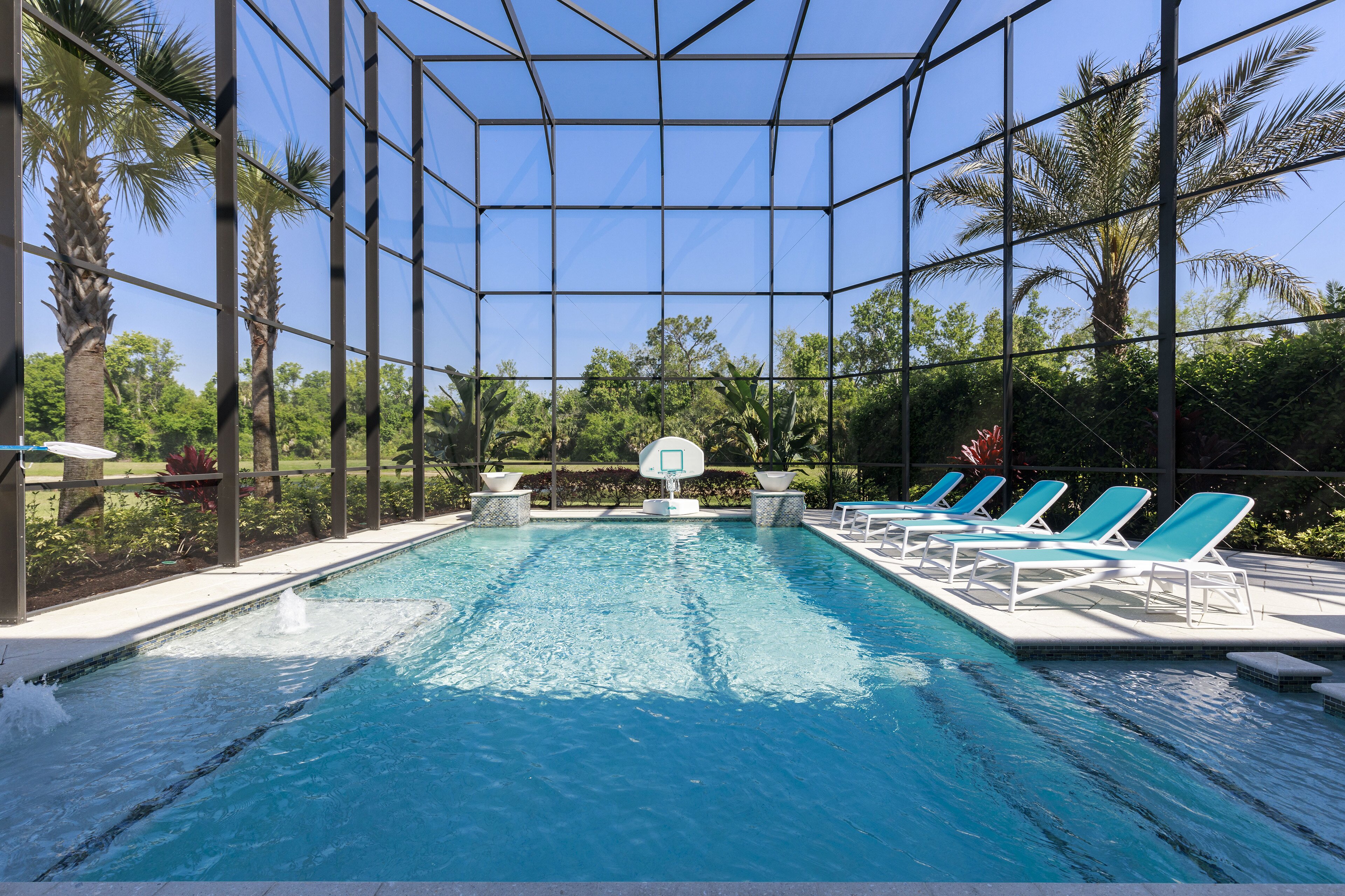 This whitewashed home in Orlando’s Reunion Resort is very sleek, chic and creatively modern. Its huge white exterior is instantly eye-catching, and the expansive interior – with 7 bedrooms and 7 bathrooms – sleeps up to 14 guests in stylish luxury. There’s a large open-plan living area that takes over the downstairs; plenty of sofa seating makes the most of the huge TV centrepiece, and there’s a smart kitchen and indoor dining area for home-cooked meals. Spacious en-suite bedrooms include themed kids bunk rooms and generous king size beds. Each one is decorated in a different style to the last, with bespoke furniture pieces and gorgeous bathrooms that can include a large shower or indulgent free-standing tub. Some bedrooms also have access to the spacious downstairs terrace or balcony upstairs. Lake View is a villa with plenty of imagination, and includes a video arcade games room and cinema room for the youngsters – this ‘drive in’ home theatre comes complete with fun car seating and a huge projector screen. Grown-ups should head to the upstairs lounge bar, which has access to an impressive balcony overlooking the lake. Outside, you’ll find a large private pool with a spillover tub and in-pool loungers, and there’s also an outdoor kitchen with BBQ and an al fresco dining area for those warm summer nights. There are plenty of sun spots and poolside seating on the terrace, or the covered lanai includes a cosy fireplace and relaxing lounge seating with an outdoor TV.
