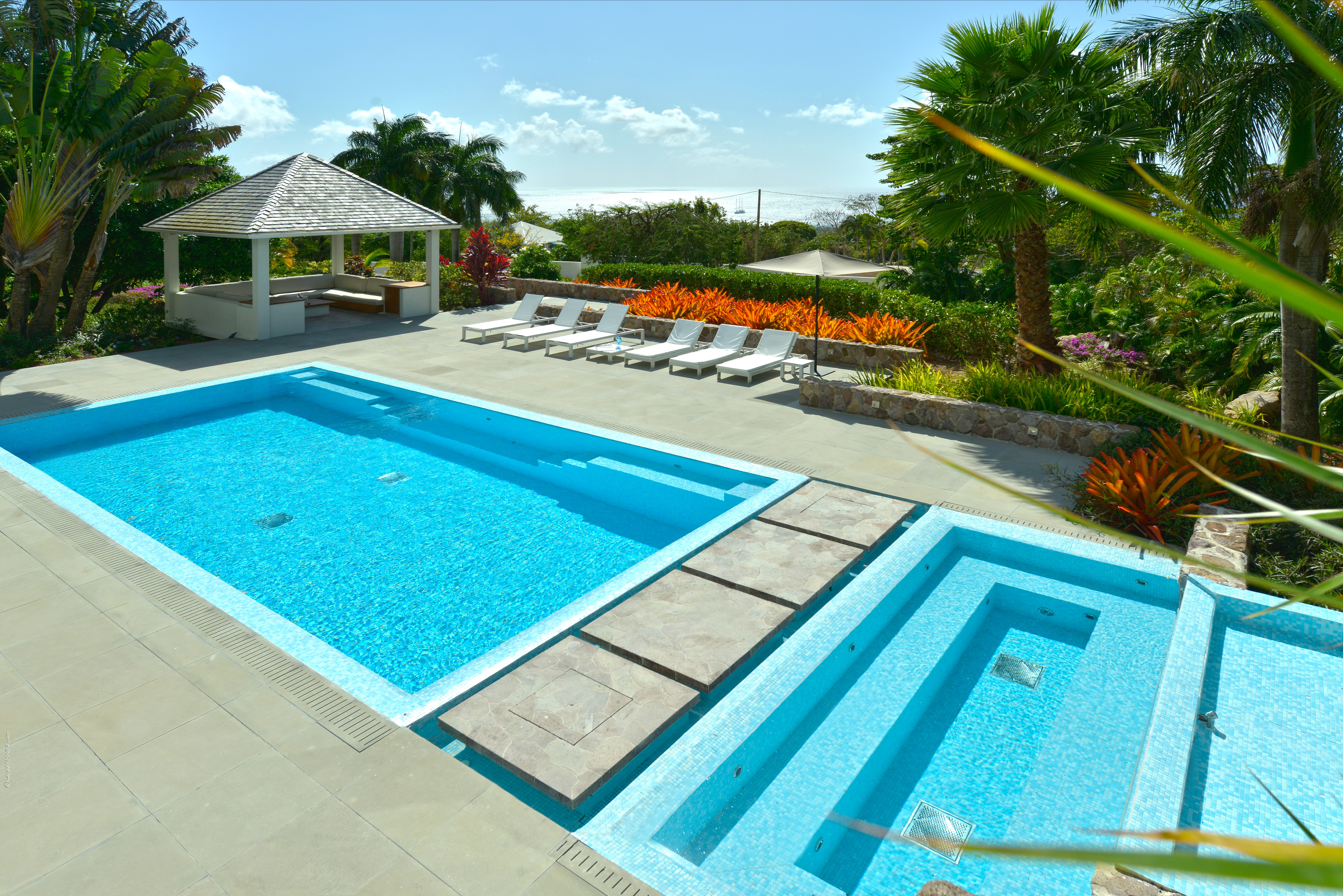 Unrivalled luxury hideaway with heavenly views towards the island of St Kitts and the Caribbean sea, a magical garden playground outside next to a 5-star golf course.