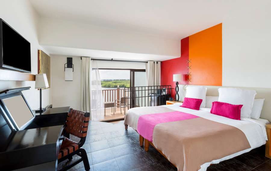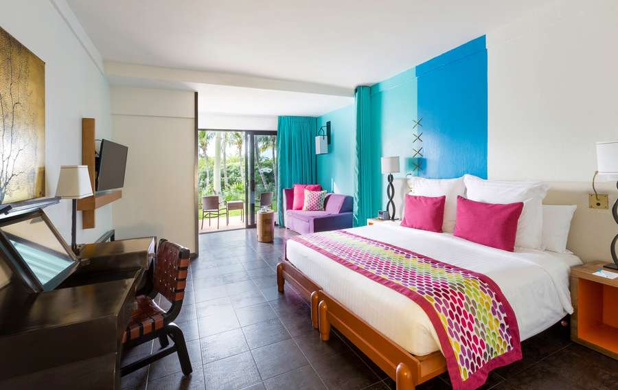 These rooms are available throughout the Resort on all of the upper floors. They have furnished balconies with views of the lagoon or gardens. Bright colours set the tone.