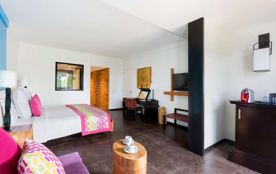This room has not one but two terraces of its own. Facing the sea or facing the lagoon, the choice is yours. The interior design uses bright colours, such as reds and purples.