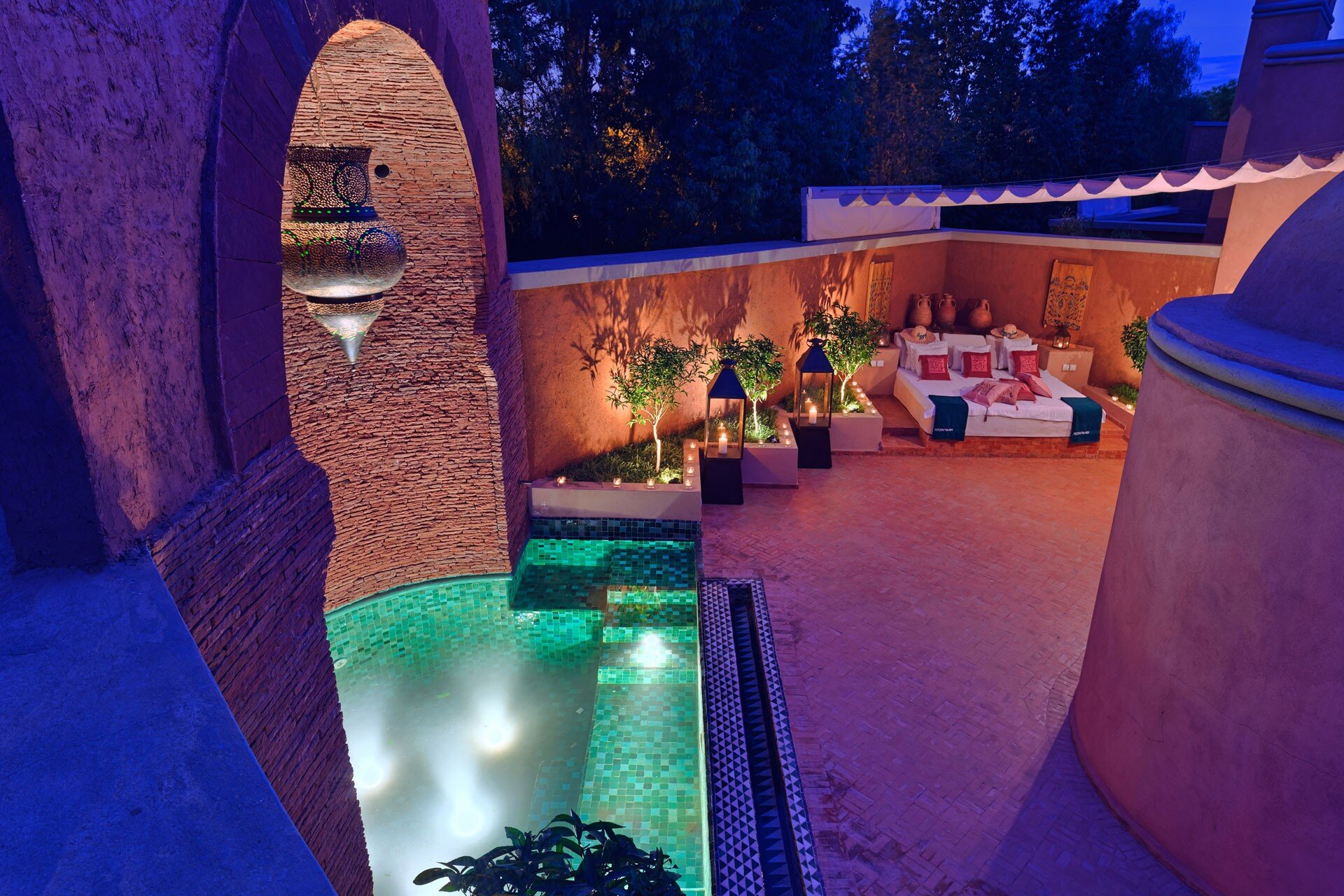 Within easy reach of vibrant Marrakech and the magnificent scenery of the Atlas Mountains and the Ourika Valley, this remarkable luxury villa south of Marrakech offers a very private, quiet retreat in a location that allows guests to combines a sophisticated city break with exploring the great outdoors. Beautifully designed, property has a traditional Moroccan design and is furnished in a blend of classic and contemporary styles, with neutral colours, crisp whites, with splashes of colour and local rugs. The accommodation develops around an impressive classical central patio with water feature. The charming drawing room is furnished with understated elegance with contemporary comforts and intriguing artefacts and opens to an extensive terrace for soft seating and a dining overlooking the gardens. Guest rooms are in two settings. On the ground floor of the main villa there are three spacious and elegant double bedroom suites, all individually styled with bathroom en suite with separate walk-in showers opening to the gardens. Accessed via a staircase in the red TV room, the very spacious master suite is romantically furnished with a four poster bed and opens to a terrace with far reaching views of the Atlas Mountains. The extensive panoramic roof terrace for sundowners can also be accessed from this level. There are three more slightly smaller, but also very comfortable guest rooms and sitting room in a Pavilion in the grounds.