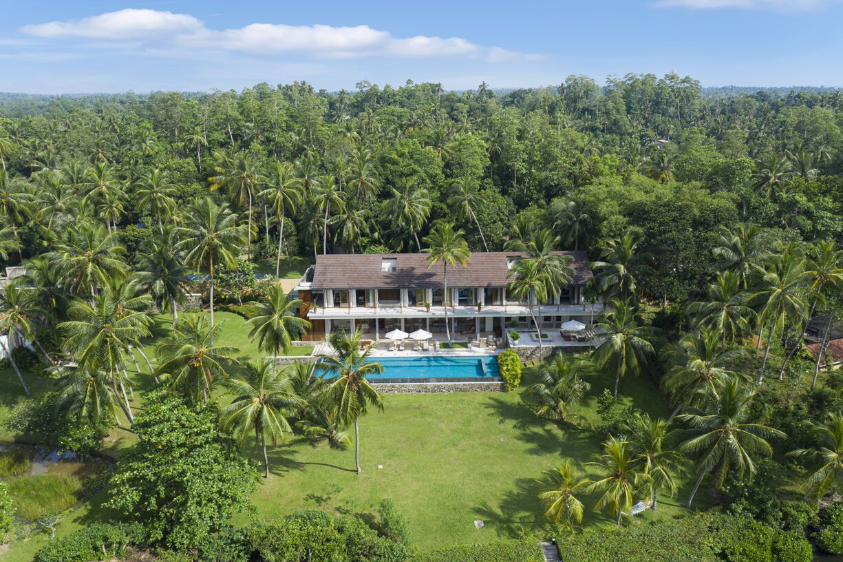Positioned high on a hill with far reaching sea views, Cinammon House sits at the ocean’s edge surrounded by lash lawns and tall swaying palms. This superb, modern property was designed by famous architect Geoffrey Bawa and its unique, multi terraced living space has been created to enjoy one of the best vistas in southern Sri Lanka of the inviting Indian Ocean. The upper terrace has a dining level with a polished concrete table for twelve; the middle tier has two comfortable sofas and a huge bean bag chair, whilst the lower level is decked with further stylish seating and a coffee table. There are five bedrooms, three in the main house all with garden and ocean views and a further two towards the rear of the house accessed via a covered walkway. All bedrooms are en suite and three have private tropical outdoor showers.